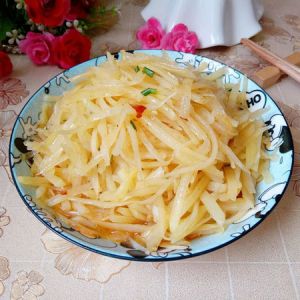 土豆丝捞出淋干水分,倒入锅中,加老干妈辣酱(根据个人口味增减)。加入醋,盐煸炒2分钟关火。