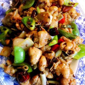 锅内底油加麻椒花椒炒香,再放入葱姜蒜,然后放入干辣椒小米辣(刚买的干辣椒不知道辣度,用小米椒增辣度,真的很辣),炒出香味,把洋葱青椒放入翻勺几下