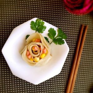 一朵花要四张饺子皮,一张落一张上面,饺子皮的中间放肉馅,铺平