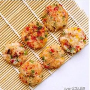 手中沾少许量,取一块虾泥放入手中,压成饼状。