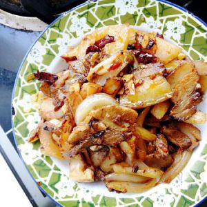 倒入切好的洋葱,先不要翻动,让肉再煎一下,后翻炒洋葱,倒入酱油,锅边淋一下水,的后倒入蚝油翻炒。