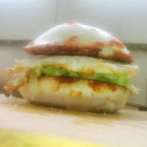 按照,馒头,圆白菜,煎蛋,馒头的顺序盖好。可以吃啦!可以搭配果汁一起食用