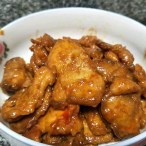 煎好的里脊肉乘出备用,锅内放入少量的油,加盐,糖,陈醋,烧开放入里脊肉,收汁的时候我放了少量的番茄酱。