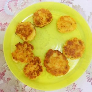 土豆泥、胡萝卜、和剔下来的鳕鱼肉混合、加上一点点一点点盐(其实也可以不加、因为鳕鱼本身就有淡淡的咸味)再加上一小撮胡椒粉、最后再加上棒子面混合均匀、揉成软面团