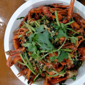 再倒入龙虾翻炒,倒入适量的水煮,慢慢炖熟收汁,再加入朝天椒剁辣椒,蚝油(根据自己口味来加),再加鸡精。
