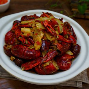 加入炸好的小龙虾快速翻炒匀,一大勺料酒,一勺生抽