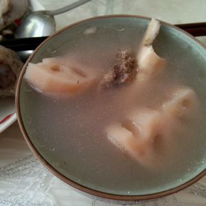 大火煮开后,有浮沫就撇去,加入葱段,煮大概一个小时左右加入莲藕