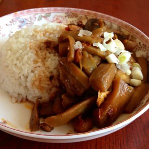 加入茄子大火翻炒,倒一点料酒,由于是做盖浇饭,最后加了一点开水,大火煮开后关火盛出,ok