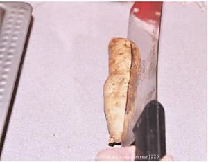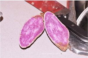 切好的紫薯里面就是这个样子,一分为二备用