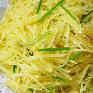 土豆丝放入锅中爆炒,待土豆丝颜色转趋透明后,加入盐1/5茶匙,糖1/2茶匙,酱油1/2茶匙,醋1茶匙,拌匀炒热