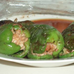 将锅烧热放一点油,就像做虎皮青椒的量,待到油5、6成热时把装好馅的青椒放入锅内干煸,不要翻炒,做法就像做虎皮青椒,时不时的翻下面就行了。