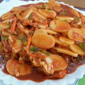 倒入年糕片,韩式辣酱,白糖,蒜片中火炒4-5分钟。出锅即可。