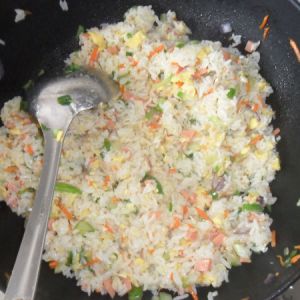 先热油锅,煎蛋装盘,在放切好的配料炒香,再放备好的米饭翻炒,最后放盐即可。