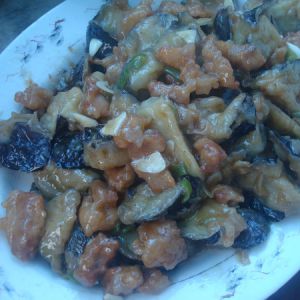 锅中留底油~用葱花爆锅~加蚝油~添水~加糖~盐~白胡椒粉~酱油适量~汤汁调好后~加水淀粉勾芡~把炸好的茄子和肉丁下如~加蒜片~翻炒均匀淋香油出锅!~