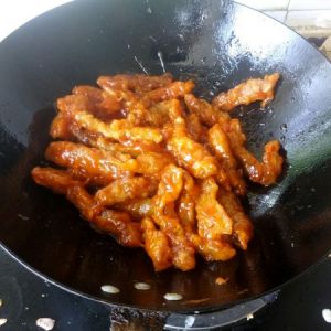 立刻将炸好的肉段倒入锅中,快速翻拌均匀出锅。(翻拌时间不要太长,表面会不催。)