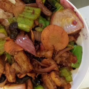加入辅料青椒、洋葱、木耳、胡萝卜大火翻炒。