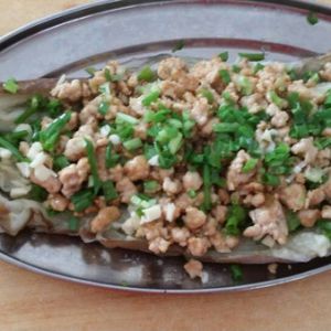 煎好切开放好,瘦肉用淀粉鸡精盐调好放入锅中加五香粉快速炒熟;随后依次将炒好的瘦肉、蒜末、葱花均匀撒在茄子上面。