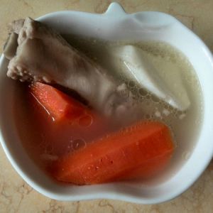 30分钟后,放入山药、胡萝卜大火烧开后,转中火煲15分钟左右即可,下盐调味开吃了