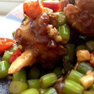 将排骨倒入锅中,快速与芡汁拌匀,加入炒好的蒜薹等配菜,出锅前滴入香油增色。