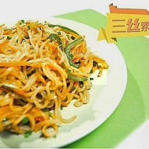 热锅中倒入油,趟一下锅,将青椒丝、胡萝卜丝、包菜丝放入锅中翻炒