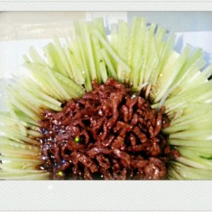 二、大葱去掉大部分葱叶,余下切丝 放入盘中间作为垫菜,黄瓜切丝摆在盘周围