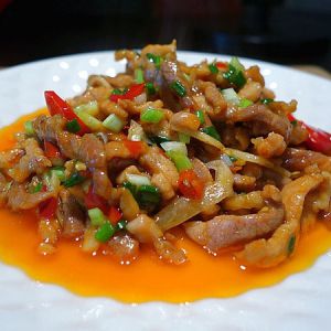 炒锅里面放油,油温四成热时滑入肉丝,先不要去翻动它,过早的翻动,会让肉丝外面的那层蛋清淀粉糊散乱,不能完美的裹附于肉丝之上。让肉丝稍微凝固之后,迅速把它滑散,加入仔姜丝、酸姜丝、泡椒丝同炒,此时根据色泽和咸度加晒制特抽(老抽也可)。此步骤一定要谨慎,因为酸姜和泡椒已经够咸。