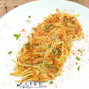 将土豆丝,胡萝卜丝,葱丝放入容器中,加入生粉