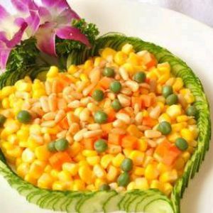 玉米用手将玉米粒拨下,胡萝卜切丁,豌豆粒、松仁备用