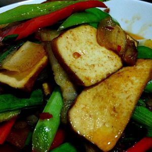 五花肉冷水下锅煮开后煮十分钟去膻腥,捞起待凉切薄片,青蒜切段,青红辣椒切菱形,豆腐干切片,热锅下油放五花肉煸炒加几滴料酒,炒到微卷加入姜丝蒜片炒香,继续把肉划到一边留余油加一勺豆瓣酱半勺甜面酱炒香出红油,记得调小火,不要炒糊了,然后加入豆腐干一起炒,陆续加入青红辣椒翻炒断生加入花椒粉倒几滴生抽就可以出锅啦,是不是很简单呢,很下饭的一道菜!
