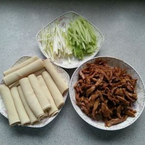 切葱丝、黄瓜丝,豆腐皮焯水切片。