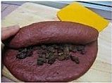 取出排气,醒发15分钟。将面团擀开,铺上葡萄干,从上往下卷起面团。