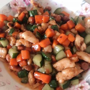 下入鸡丁,黄瓜丁,胡萝卜丁翻炒,放入调好的汁,再放入盐调味,最后放炒熟的花生即可
