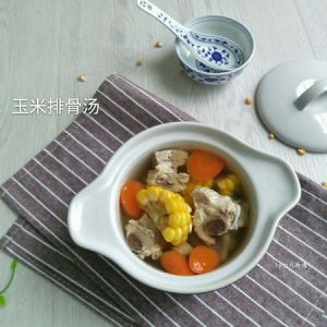 将排骨、玉米、胡萝卜、姜放入砂锅,滴入几滴白醋和一汤匙米酒