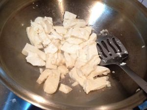 锅中烧油,待油热后放入豆腐(我一般都是把豆腐放锅里以后再用铲子铲碎,不事先切)。放入蒜,用小火煎至豆腐微黄