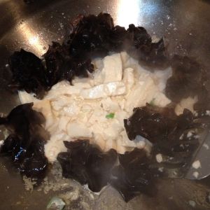 放入葱,木耳,撒盐,倒一小点酱油,翻炒均匀。