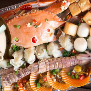 摆上处理好的螃蟹,鱼皮饺,扇贝,大虾和皮皮虾,鱼丸和鱼豆腐,蛏子和花甲