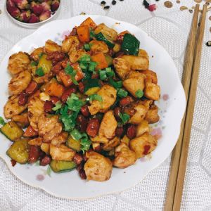 加入蔬菜,炒熟后导入鸡丁,加一勺生抽,一点点盐糖调味。