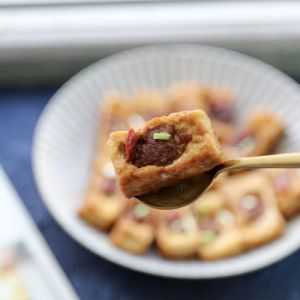 把豆腐中间挖一小块出来,最好挖成半球形,小心不要把底挖穿咯。