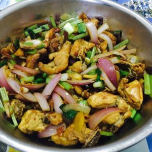 准备所有食材,鸡肉剁块,不要太小,姜、土豆、辣椒切菱形,蒜整颗,洋葱切块,和辣椒差不多大
