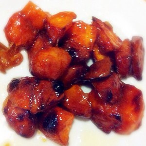 锅抬起来离开灶倒入红薯,让红薯均匀挂上糖浆,(事先找一个盘子涂一点熟油以防糖粘到上面),装盘!!!!