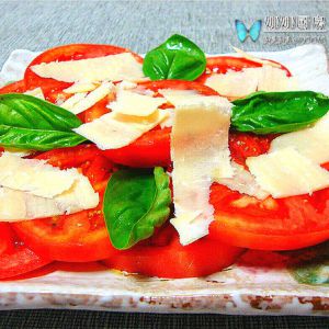 意大利干酪刨成薄片撒在上面,点缀罗勒叶