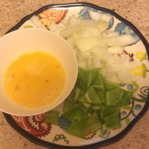 洋葱青椒切块,鸡蛋打散放盐少许