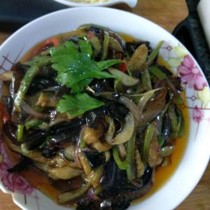 锅里留底油,姜蒜炒香加入青红椒丝,木耳丝,洋葱丝,芹菜丝,翻炒均匀。