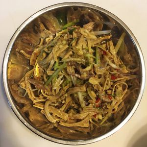 将之前剁碎的辅料与鸡腿肉拌在一起,锅内烧适量油,油辣后,凉一下,淋在鸡腿肉和辅料上(这里也可以加入豆腐皮或者木耳)