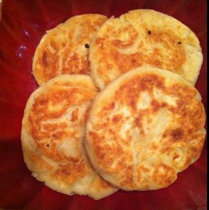 放到平锅里煎时'将饼下扁越薄越好'煎至两面金黄金黄的就成了'盛热吃口感非常好'外脆内软嫩'''