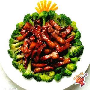 把做好的肉,倒入摆好西蓝花的盘子中间