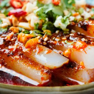 在切好的凉粉上,浇上调好的酸辣汁,撒上花生碎、小米椒圈、葱蒜末和香菜末,伤心凉粉完成!