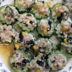 酿入苦瓜,放在盘子里,上锅蒸,大火6分钟!