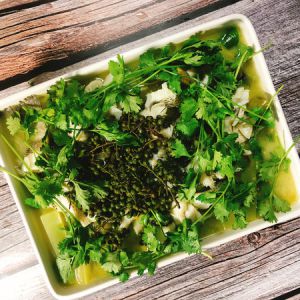全部摆盘码好青花椒,热锅热油浇在花椒上。