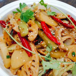 加入其他蔬菜,剩下的干辣椒,略微翻炒后及时出锅。